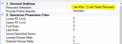 DSSO로 반응시킨 시료에는 DSSO가 결합된 펩타이드와 함께 결합되지 않은 일반 펩타이드가 존재합니다. 그래서 검색시 이 두 가지 펩타이드를 모두 검출하는 workflow가 필요합니다. 앞 단계는 동일하지만 XlinkX detector에서 Use MS(n-1) with Parent Precursor로 설정합니다 Crosslink Modification은 DSS/+158.005 Da를 설정합니다.