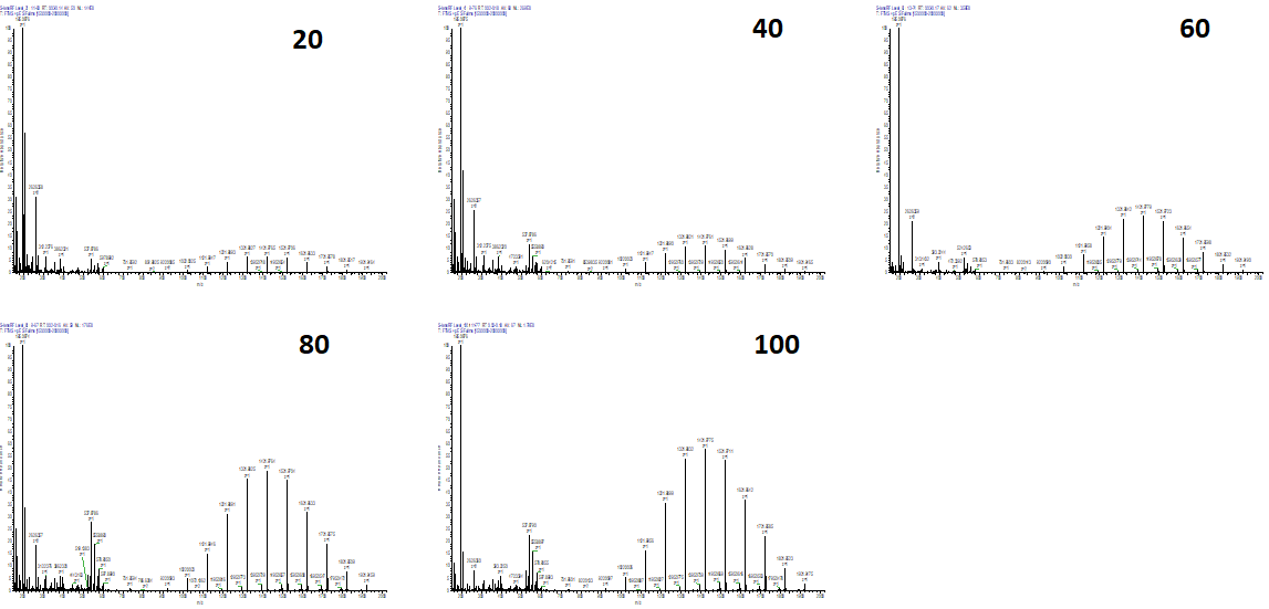 아래 그림은 Calmix를 infusion으로 흘려주면서 서로 다른 RF Lens 에서 측정한 스펙트럼입니다. RF Lens값이 증가 될수로 높은 m/z 값을 가지는 피크들의 높이가 상대적으로 증가됨을 볼수 있습니다.