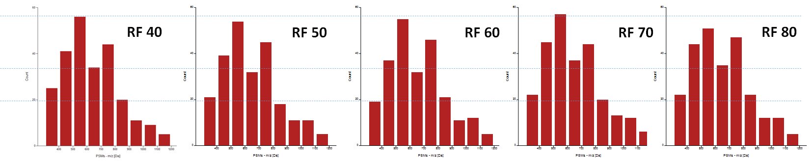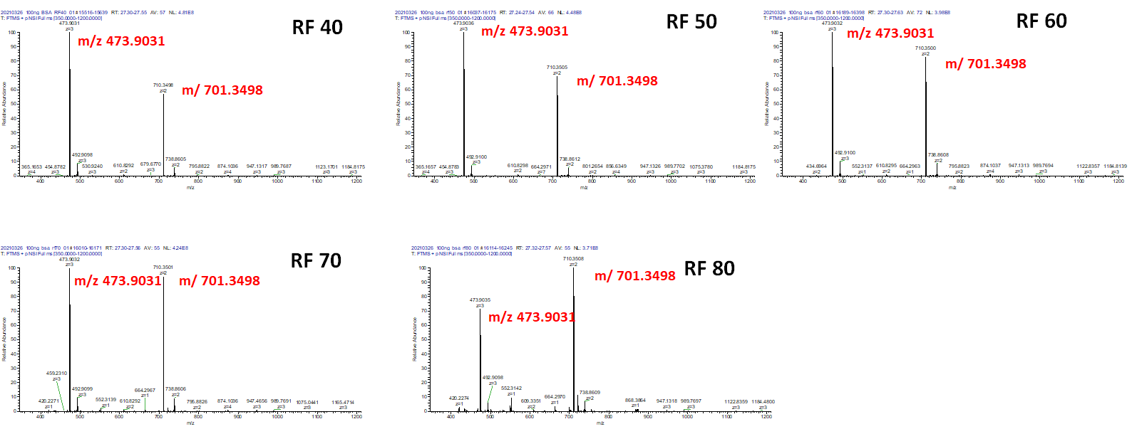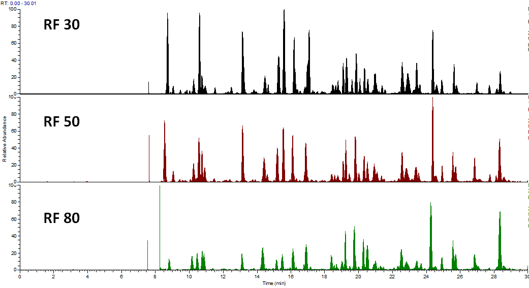 아래그림은 서로 다른 RF 값 (40, 50, 60, 70, 80)에서 분석한 BSA 크로마토그램입니다. Base-peak chromatogram상으로는 큰 차이가 없습니다.