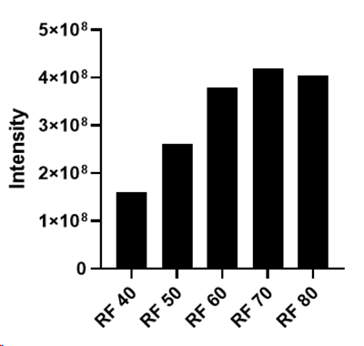 RF 값을 변화시키면 서로 다른 m/z값을 가지는 이온들의 intensity가 달라집니다. Ion transmission 의 efficiency가 약간씩 달라진다고 알고 있습니다. RF값이 증가될수록 높은 m/z값을 가지는 이온들의 intensity가 증가되는 경향이 있습니다. 기본적인 값이 50 혹은 60 % 입니다.