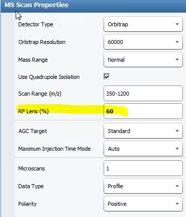 Radio frequency (RF) Lens(%)값이 있습니다. 이온들을 통과시킬때 영향을 주는 파라미터입니다. . 보통 기본값이 60%로 되어 있습니다.