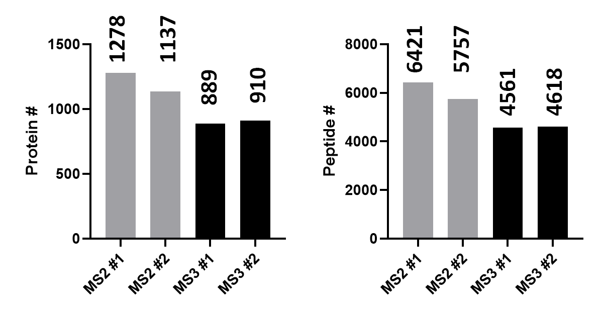 TMT MS2 와 MS3 방법에서의 단백질 검출수 비교