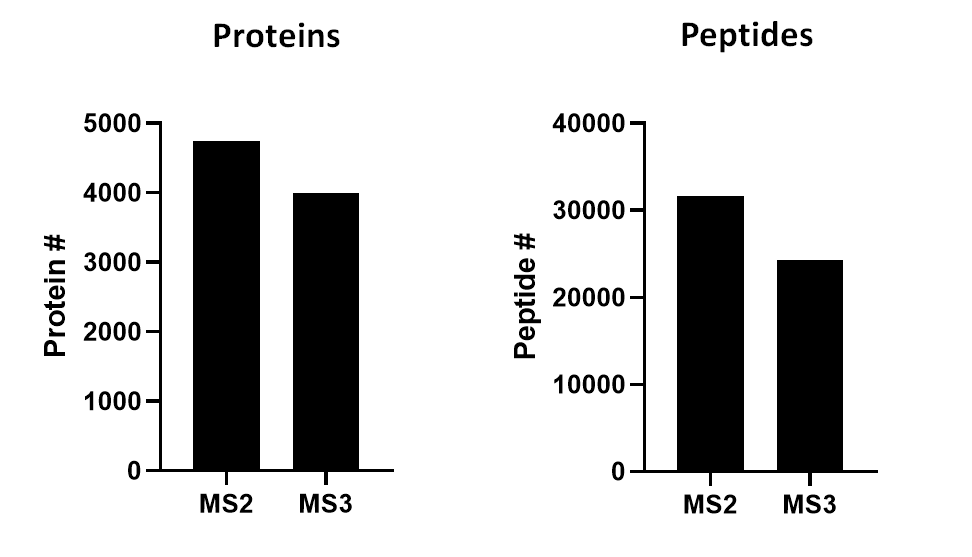 아래 그래는 각각의 분석법에서 검출한 단백질과 펩타이드 수입니다. 예상대로 MS3가 MS2 방법에 비해서 적은 수의 단백질과 펩타이드를 검출하였습니다. 하지만 크게 나쁘지는 않습니다.