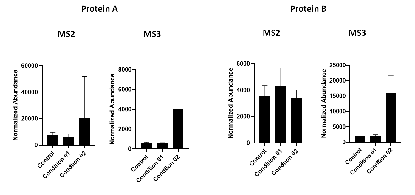 아래는 2개의 서로 다른 단백질이 3가지 조건에서 MS2와 MS3에서 어떤 비율로 검출되었는지 보여줍니다. MS3에서 상대적인 변화율이 크게 보입니다.
