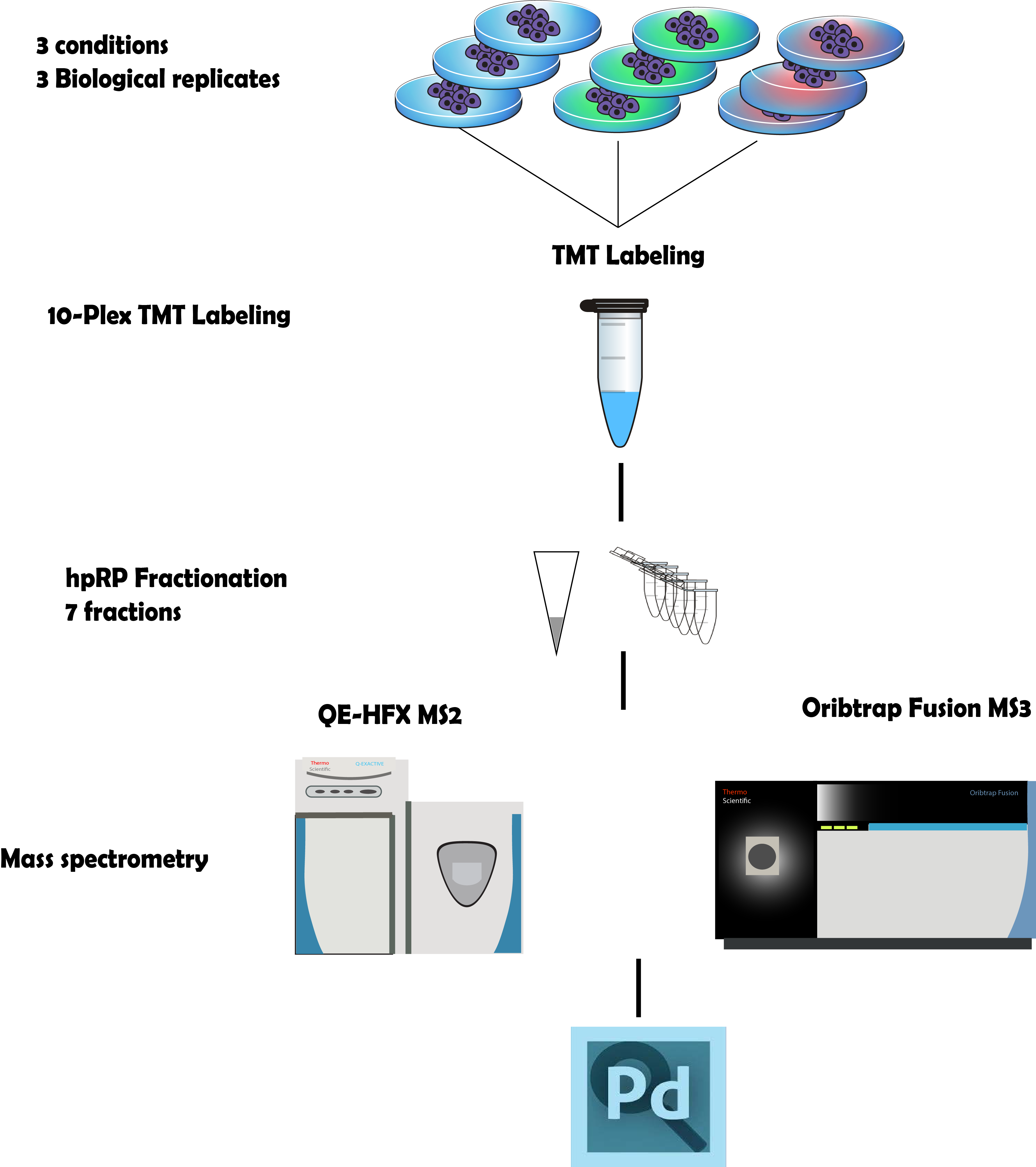 10-plex TMT로 labeling을 한후 stage-tip hPRP로 7 fraction을 얻었습니다. Q-Exactive HFX로 MS2를 Orbitrap Fusion2로 MS3 를 수행하였습니다. 각 분획은 2시간 LC gradient를 사용하였습니다. 검출결과는 Proteome discoverer 2.4로 분석하였습니다.