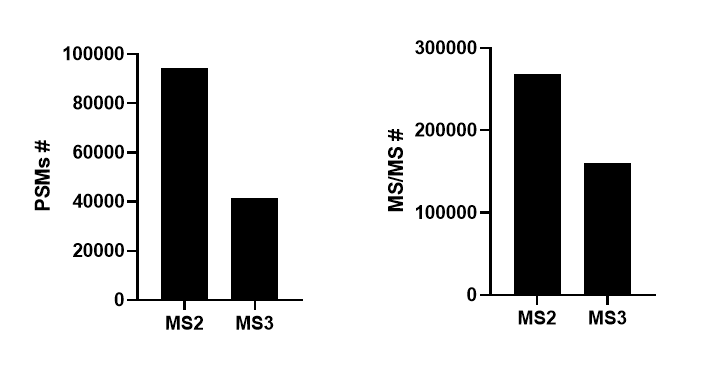 MS2와 MS3를 비교해보았을때 검출된 단백질 및 펩타이드의 수에서는 MS3가 낮은 효율을 보입니다. 두개가 서로 다른 장비에서 분석되었기 때문에 장비에서 오는 차이가 있을수 있습니다. 하지만 정량분석에서 중요한 정량성은 MS3가 훨씬 좋은 결과를 보였습니다.