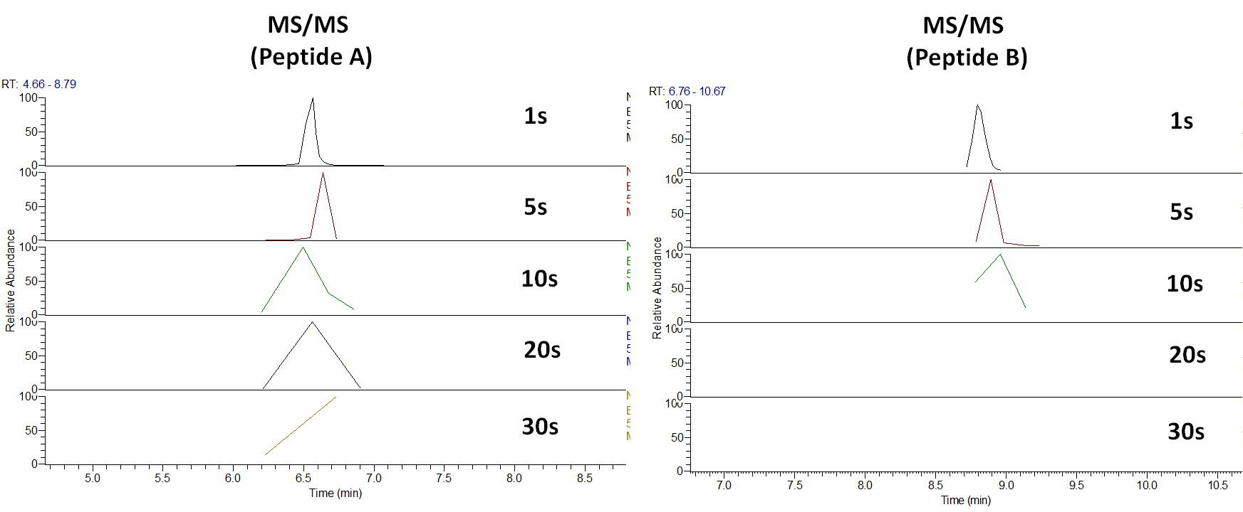 아래는 각 펩타이드에 대해 서로다른 dynamic exclusion time 에서의 MS/MS XIC 입니다.
