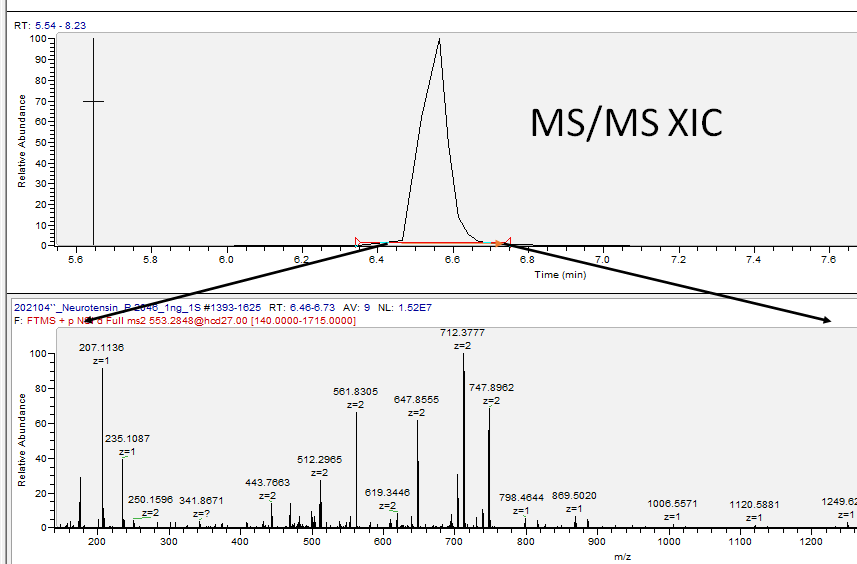 Dynamic exclusion time이 늘어날수도 MS/MS 되는 횟수도 줄어듭니다. 특히 intensity 가 낮은 펩타이드 B의 경우 20초, 30초 에서는 한 번씩만 MS/MS가 수행되었습니다. 즉 몇개 안되는 펩타이드의 경우 dynamic exclusion time 을 줄이는것이 좋습니다. 아래와 같이 해당 펩타이드의 MS/MS 크로마토그램에 해당하는 부븐을 드래그 하여 MS/MS 된 스펙트럼의 합으로 보여지게 할 수 있습니다
