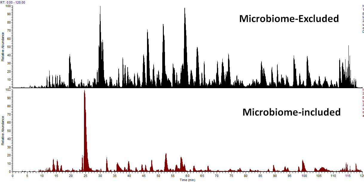 아래는 microbiome이 제거된 시료와 포함된 시료를 DDA로 3번씩 분석하였습니다. 아래는 대표적인 크로마토그램입니다.