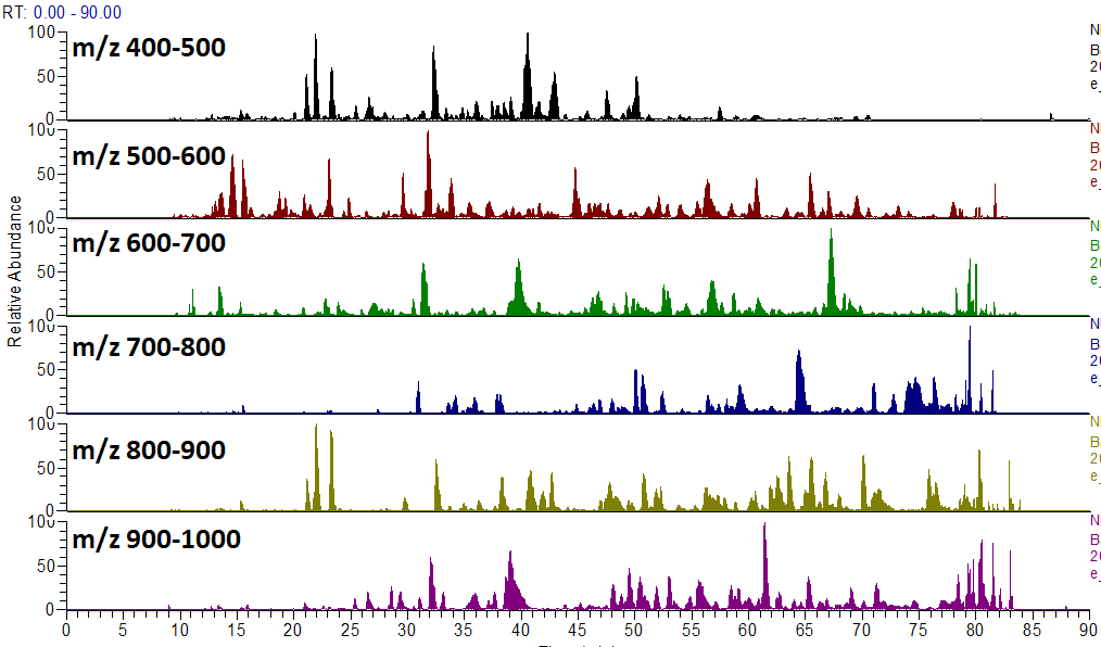 아래는 microbiome-free 시료의 Gas-phase Fractionation DIA에 대한 크로마토그램입니다