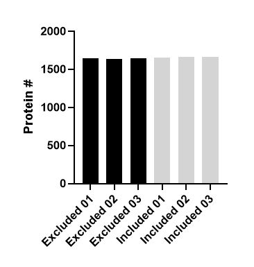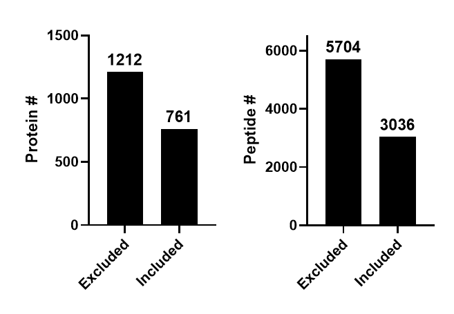 아래는 3번의 반복실험에서 얻어진 단백질과 펩타이드수에 대한 그래프입니다. 예상대로 Microbiome이 제거된 시료에서 더 많은 수의 단백질과 펩타이드가 검출되었습니다.
