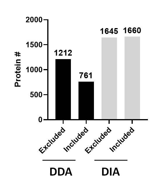 3번의 DDA와 3번의 DIA 분석에서 검출된 단백질의 평균수는 아래와 같습니다. DIA에서 조금더 많이 검출이 되었습니다. 하지만 이것은 사용된 프로그램이 다르기 때문에 정확한 비교는 될 수 없습니다.