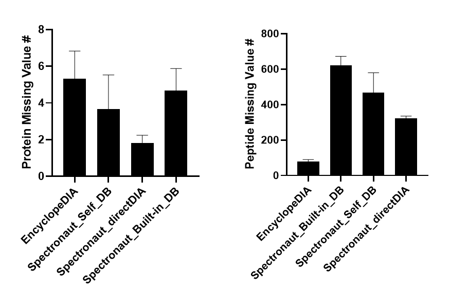 아래는 검출된 결과에서 나온 missing value값에 대한 그래프입니다. 단백질의 경우 그 숫자가 아주 미비합니다. 전체 단백질의 수가 많지 않음으로 상대적으로 missing value 수는 많지 않은것 같습니다. 펩타이드의 경우 EncyclopeDIA와 Spectronaunt 가 수 에 있어서 확연히 차이가 납니다. 동일한 시스템에서 Gas-phase fractionation을 이용하여 얻어진 spectra-library를 이용한 검색에서 missing value값이 현저이 줄어듭니다. Retention time을 감안하여 검색하기 때문에 오류가 줄어듭니다. 이러한 missing value값을 고려하게 되면 실제로 검출된 펩타이드의 수는 EncyclopeDIA가 훨씬 높을수 있습니다.