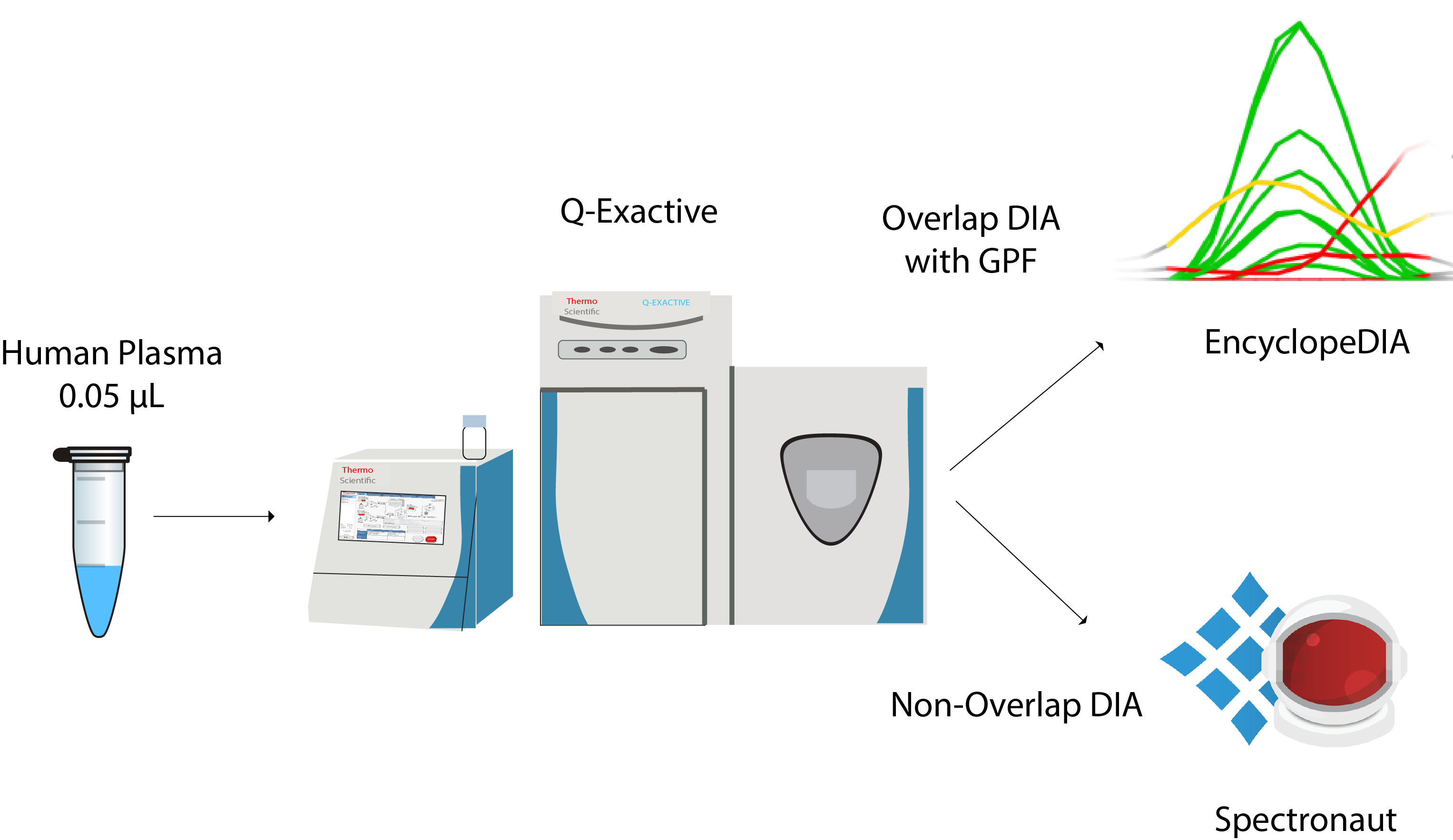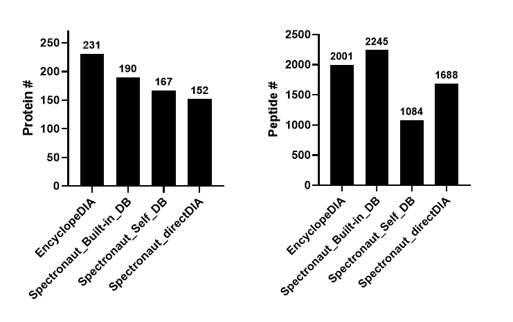 EncyclopeDIA 분석을 위해서는 Gas-phase fractionation DIA를 수행한후 실제 분석을 위해서 m/z 20 window overlap DIA (m/z 400-1000)를 수행하였습니다. Spectronaut 분석을 위해서는 m/z 20 window non-overlap DIA (m/z 400-1000)를 수행하였습니다. 각각 6번 반복하였습니다. Spectronaut분석시 3가지 방법을 이용하였습니다. 1) 프로그램에서 제공하는 Built-in Spectra-library 2) 직접 사전분획후 DDA를 통해 얻은 Spectra-library 3) Human fasta파일을 이용한 directDIA. Q-Exactive로 분석하였기에 QE-HF 나 QE-HFX에 비해서 검출되는 수는 적을수 있지만 두 프로그램을 비교하는데는 문제가 없습니다.
