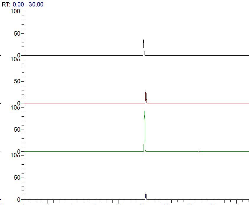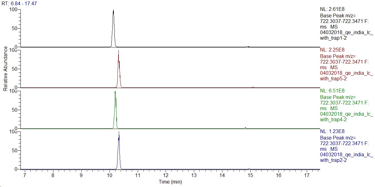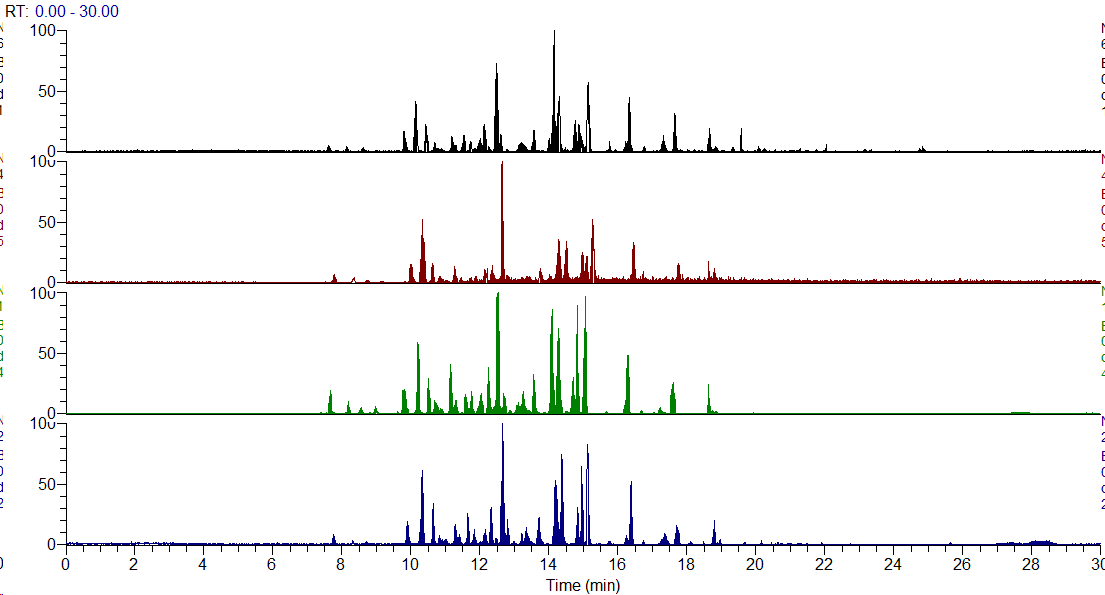 예를 들어 아래와 같이 4개의 BSA 스펙트럼이 있습니다. 전체 크로마토그램으로는 특정 단백질의 상대적인 값을 알수없습니다.