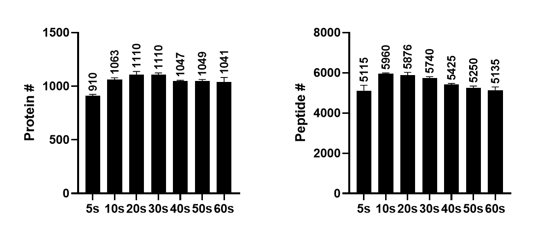 아래는 1hr LC gradient를 사용하여 5s, 10s, 20s, 30s, 40s, 50s, 60s 에서의 100ng Yeast standard 의 단백질과 펩타이드 수 그래프입니다. 전체적으로 검출된 수에는 큰 차이가 없습니다. 단백질의 수는 20s, 30s에서 가장 많고 펩타이드의 수는 10s 와 20s에서 가장 많습니다.