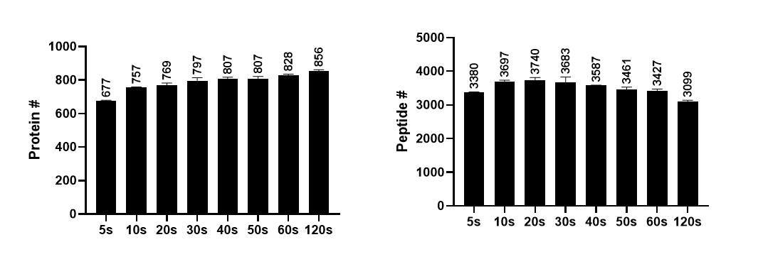 아래는 30 min LC gradient를 사용하여 5s, 10s, 20s, 30s, 40s, 50s, 60s,120s 에서의 100ng Yeast standard 의 단백질과 펩타이드 수 그래프입니다. 60 min에서의 결과와는 다르게 dynamic exlusion time이 더 긴 시간인 60s와 120s에서 가장 많은 단백질 수가 검출되었고 펩타이드의 경우 10s와 20s에서 가장 많이 검출되었습니다.