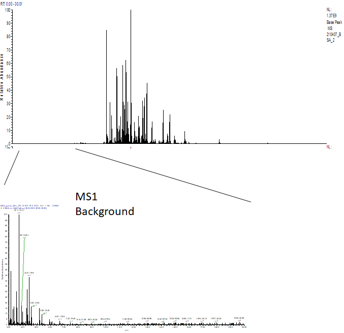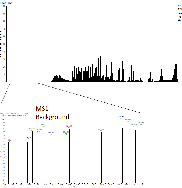 아래 크로마토그램은 이전에 분석한 BSA 크로마토그램입니다. Background가 정상적으로 보입니다.