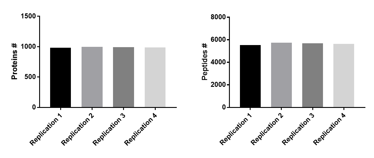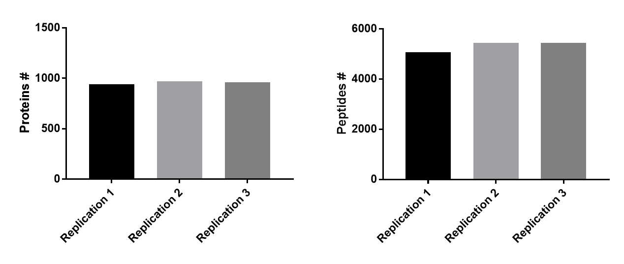 아래는 반복실험에서 얻어진 단백질과 펩타이드의 수에 대한 그래프입니다. 거의 유사한 값을 보여줍니다.