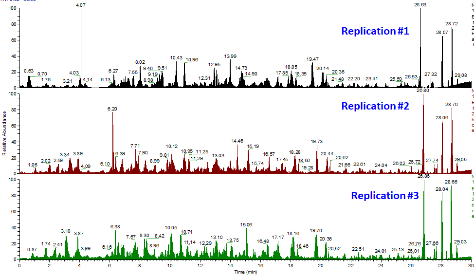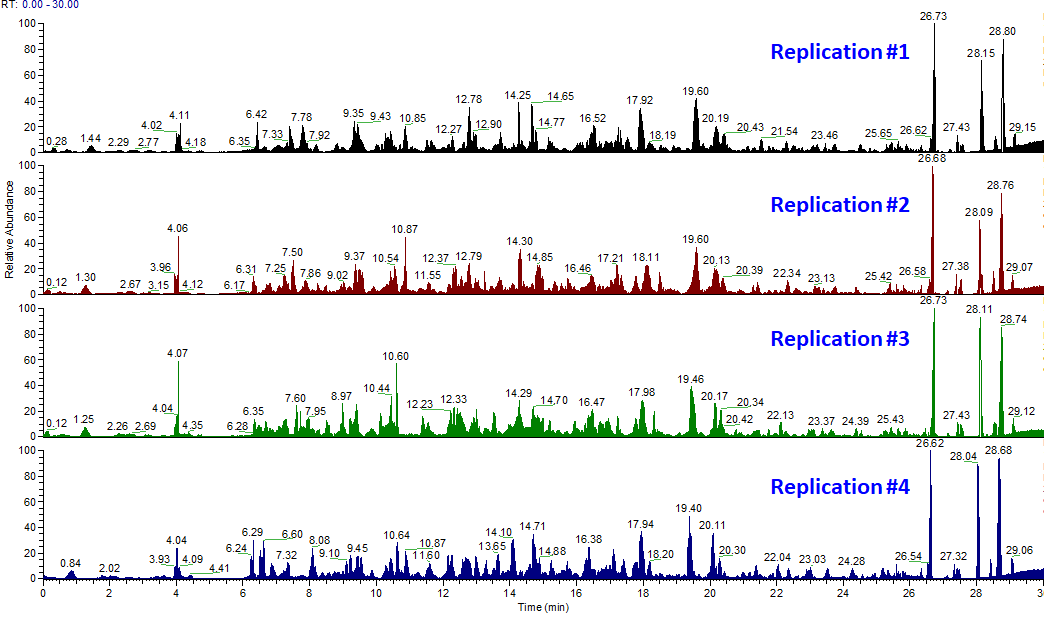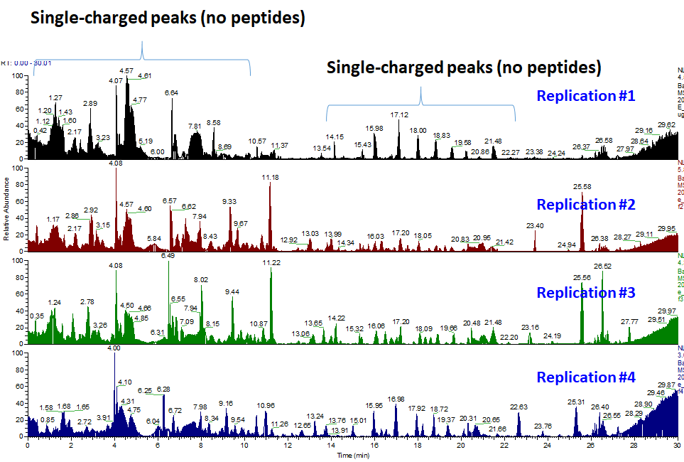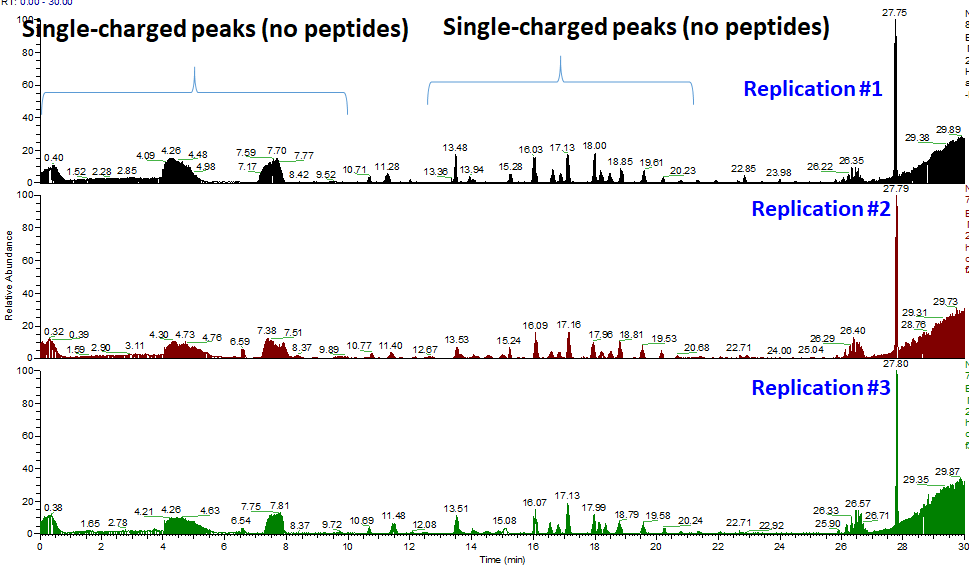 아래는 Elution에 해당하는 크로마토그램입니다. 전형적인 펩타이드 크로마토그램을 보여줍니다. 재현성도 좋습니다.