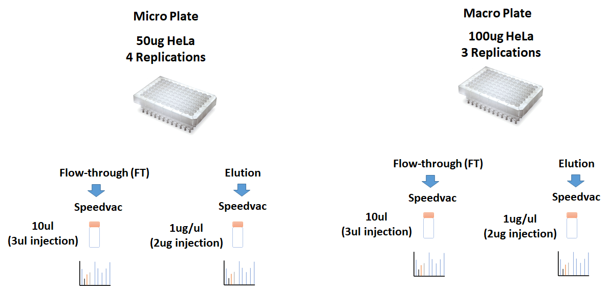 테스트 방법은 아래와 같습니다. Micro 와 Macro에 각각50 µg 와 100 µg 을 로딩하였습니다. 얻어진 Flow-through와 elution을 각각 질량분석기로 분석하였습니다.Flow-through (FT)의 경우 전체 양의 약 1/3을 주입하였고 Elution은 2µg을 각각 주입하였습니다. 피크의 존재여부만 확인하면 됨으로 짧은 30min LC gradient를 사용했습니다.