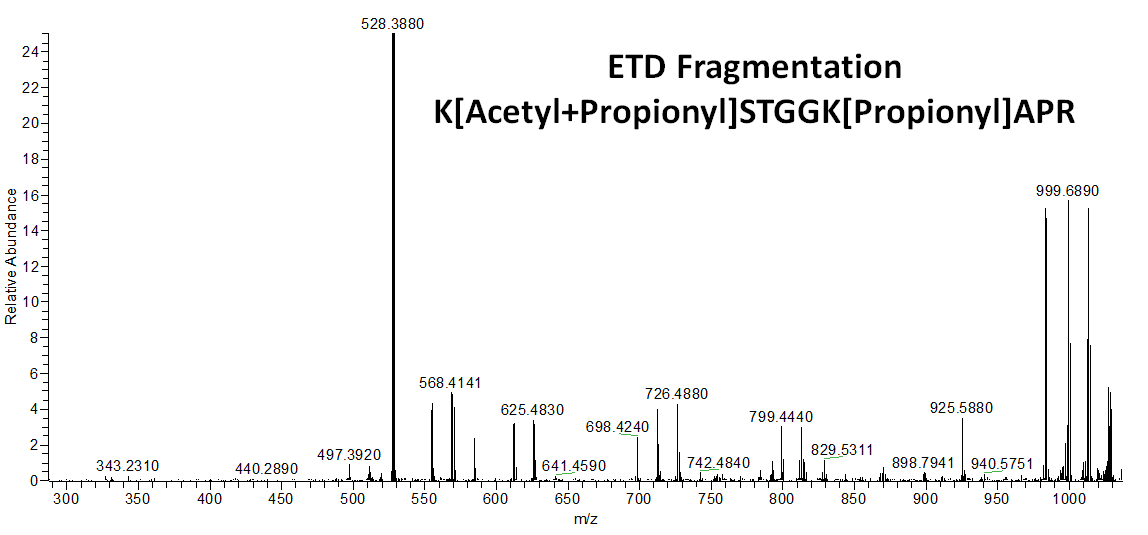 많은 ETD가 수행된것을 볼수 있었습니다. 예를 들면 다음과 같은 펩타이드 K[Acetyl+Propionyl]STGGK[Propionyl]APR (m/z 528.2958, 2+) 가 HCD에서 diagnostic peak가 검출되었고 다시 ETD로도 분석이 되었습니다.