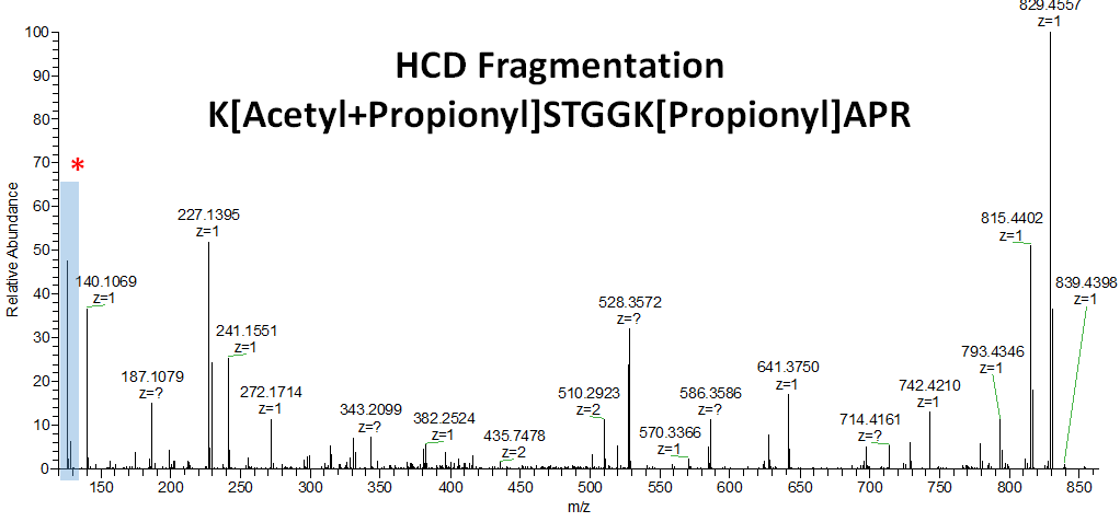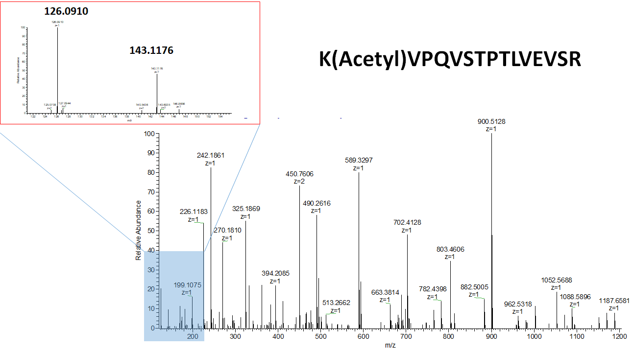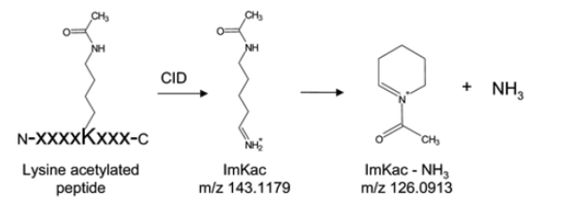 Lysine acetylation 펩타이드의 경우 MS/MS에 특정한 immonium ion이 생성됩니다. Acetyllysine의 Immonium ion 인 143.1179 Da 과 ammonia가 떨어진 형태이 126.0913 Da 이 생성됩니다. 이것은 Acetyl lysine 을 확인하는데 Diagnostic ion 으로써 사용될수 있습니다.
