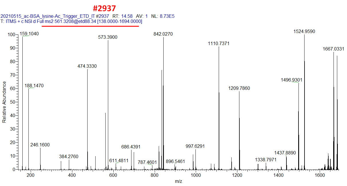 Sigmaaldrich에서 구매한 acetylated-BSA를 이용하여 테스트를 해보았습니다. 펩타이드 Sequence중에 Lysine에 Acetylation이 된 펩타이드가 존재합니다. K(Acetyl)VPQVSTPTLVEVSR (m/z 561.3210. 3+)