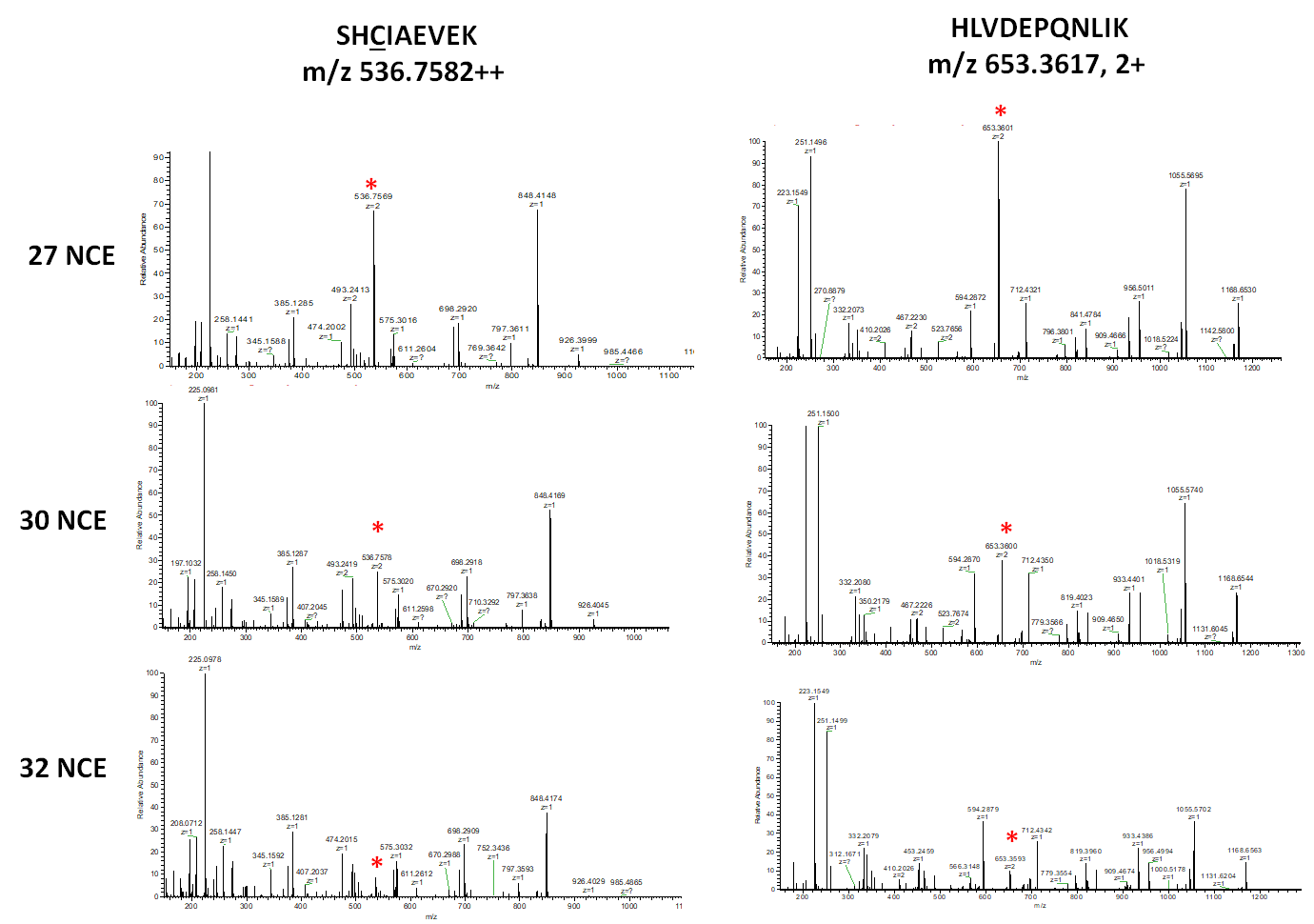 아래는 두개의 대표적인 BSA 펩타이드에 대해 27, 30, 32 NCE에 의한 MS2 스펙트럼입니다. 27 NCE 값에서 precursor ion이 상당히 남아 있습니다 NCE 값을 30, 32로 증가시키면 Precursor ion의 높이가 점점 줄어듭니다. 이렇게 특별한 조치를 하기 전까지 임시로 NCE를 조절하여 보정할수 있습니다.