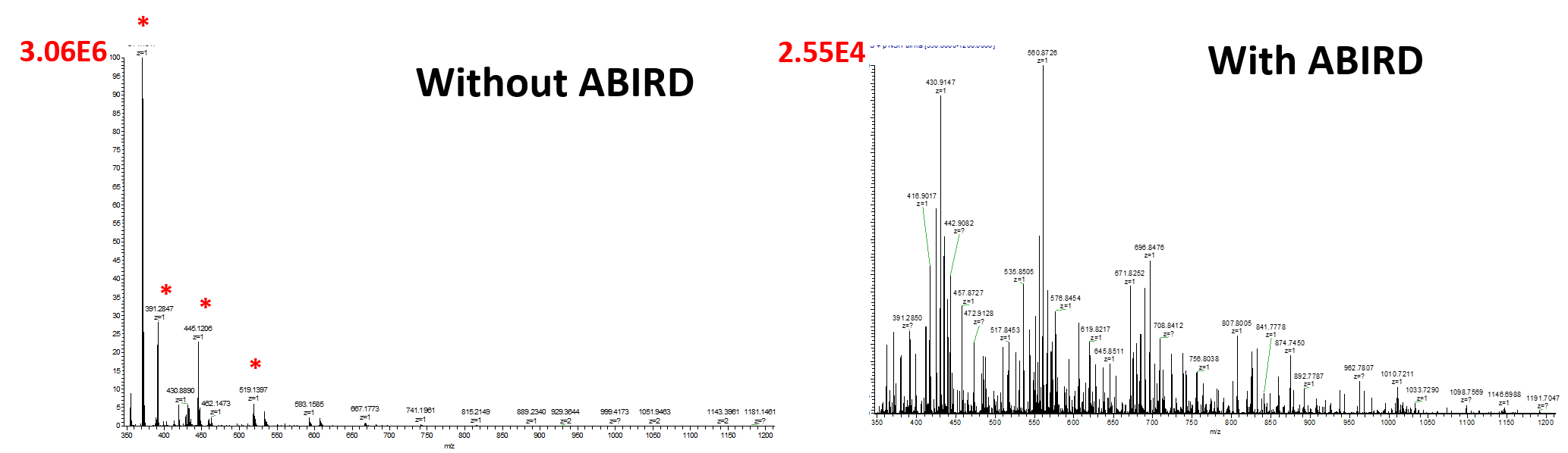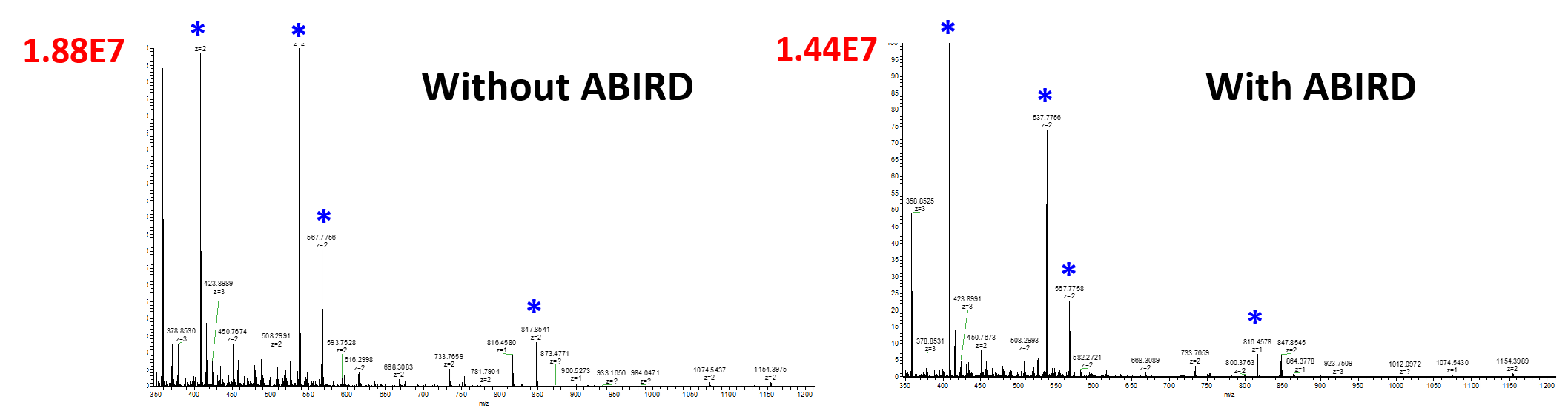 먼저 펩타이드가 용리되기 전 영역 (대부분 background peaks)에서는 ABIRD로 인해 확연히 background 피크가 감소되었다. 일반적으로 검출되는 background 피크들인 m/z 371, 391, 445, 519 (왼쪽, *)이 ABIRD 를 장착했을때는 보이지 않았으며 전체 TIC 값은 약 100배 정도 감소하였다. 즉 Background peak를 감소시키는데 큰 효과가 있었다.