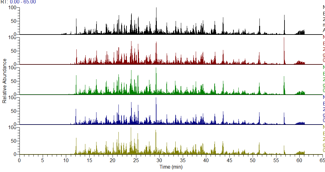 이를 위해서 200ng HeLa digest를 동일한 DIA 조건에서 5번 분석하였습니다. 아래는 크로마토그램입니다. 얻어진 raw file은 Spectronaut로 분석하였습니다.
