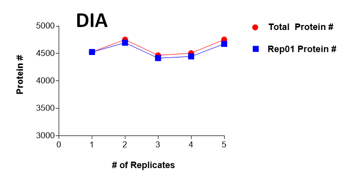 만약 Biological replicate의 수가 그다지 많지 않다면 동일한 시료를 여러번 반복분석(Technical replicates)한 결과를 포함시킨다면 얻어지는 전체 단백질수는 증가될수 있습니다. 정량분석결과에는 큰 변화는 없겠지만 검출숫자는 많아지는 효과가 있습니다