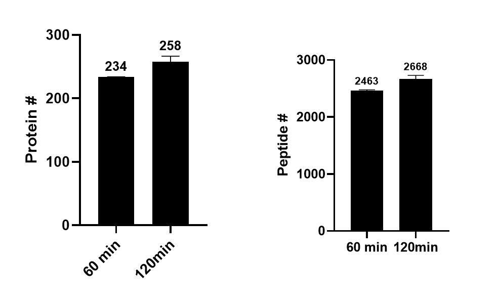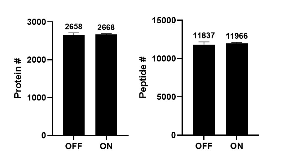 특별히 검출된 단백질과 펩타이드의 수에서 차이가 없습니다. 약 3000개 내외의 단백질이 검출되었습니다.
