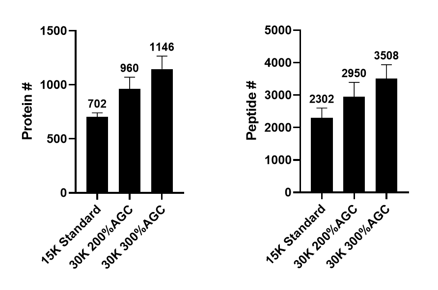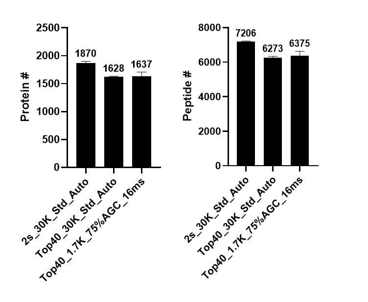 동일한 200 ng HeLa standard를 짧은 LC gradient인 30 min에서 분석해보았습니다. Gradient가 짧아진 만큼 TOP40 과 낮은 resolution/maximum injection time(MS2)와 비교해보았습니다. 특별히 최적화가 필요없이 AGC와 Maximum injection time를 기본값인 standard 와 Auto로 사용해도 될것같습니다.
