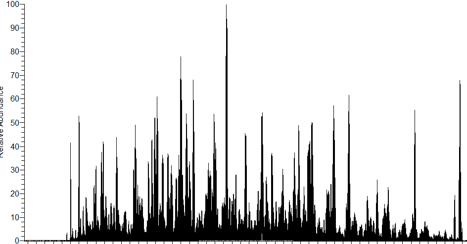 아래는 대표적인 200 ng HeLa 에서 얻어진 대표적인 Base-peak chromatogram (60 min) 입니다.