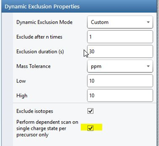 Dynamic Exclusion Properties (Singe Charge state per Precursor only)