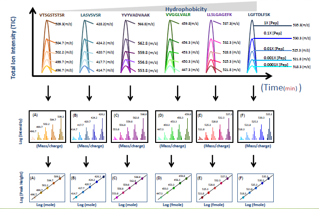 일반적으로 System Suitability 체크용 Standard 펩타이드의 경우 서로 동일한 농도를 가지는 서로 다른 펩타이드 의 Mixture이다. 혹은 일련의 서로 다른 농도를 가지는 서로 다른 펩타이드의 경우도 마찬가지이다