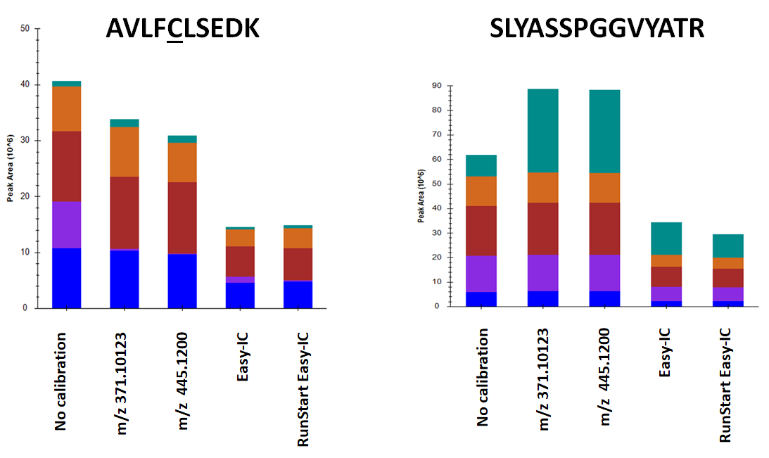DDA 방법인 아닌 PRM 분석에서도 비교해보았습니다. 이번에는 calibration을 하지 않은것과 m/z 371.10123 을 추가하였습니다. 펩타이드 종류에 따라 결과값이 다르긴 하지만 두가지 Easy-IC 방법이 User defined Lock mass 에 비해는 감도는 약간 떨어집니다. 즉 PRM에서는 Easy-IC internal calibration이 큰 효과가 없는것 같습니다.