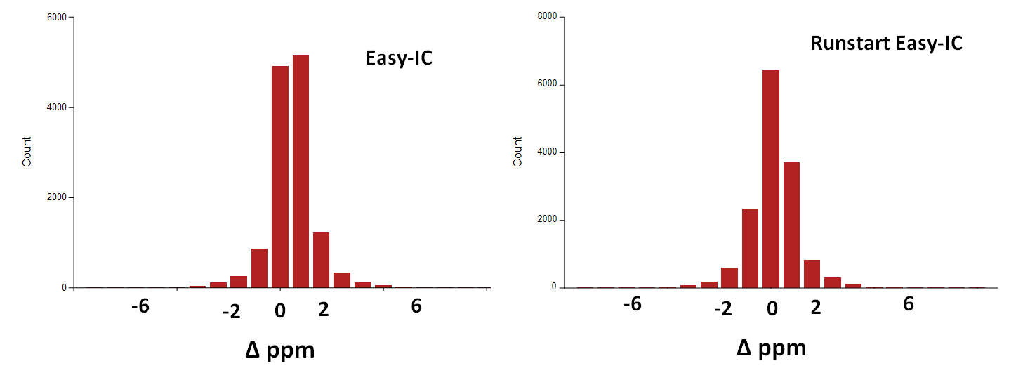 검출되는 수에는 큰 차이가 없지만 Easy-IC 방법에서는 Runstart Easy-IC 이 조금 나은것 같습니다. 기존의 방법인 background 피크를 이용하는 방법과는 큰 차이가 없는 것같습니다. 아래는 각 방법에서 얻어진 펩타이드들의 ppm accuracy 분포도입니다. 유사한 분포도를 보입니다. Easy-IC에서 보다 조금 더 높은 accuracy를 보입니다. 아마 모든 scan에서 calibration을 수행하기 때문일것이라 생각합니다.