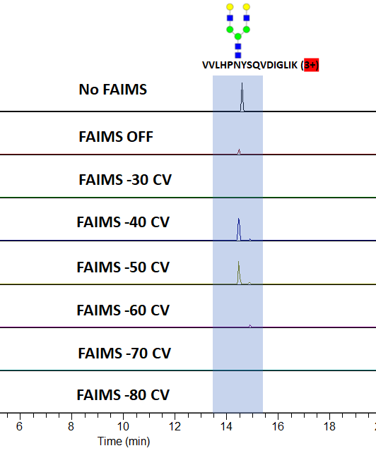 아래는 대표적인 N-linked glycopeptide인 m/z 1139.8704 (3+)에 대한 XIC 입니다. FAIMS가 없는 상태에서 예상대로 잘 검출이 되었습니다. FAIMS가 장착되었을 경우 CV값에 따라 선택적으로 검출이 되었습니다. 특별히 -40 과 -50 CV에 높은 감도를 보였습니다.