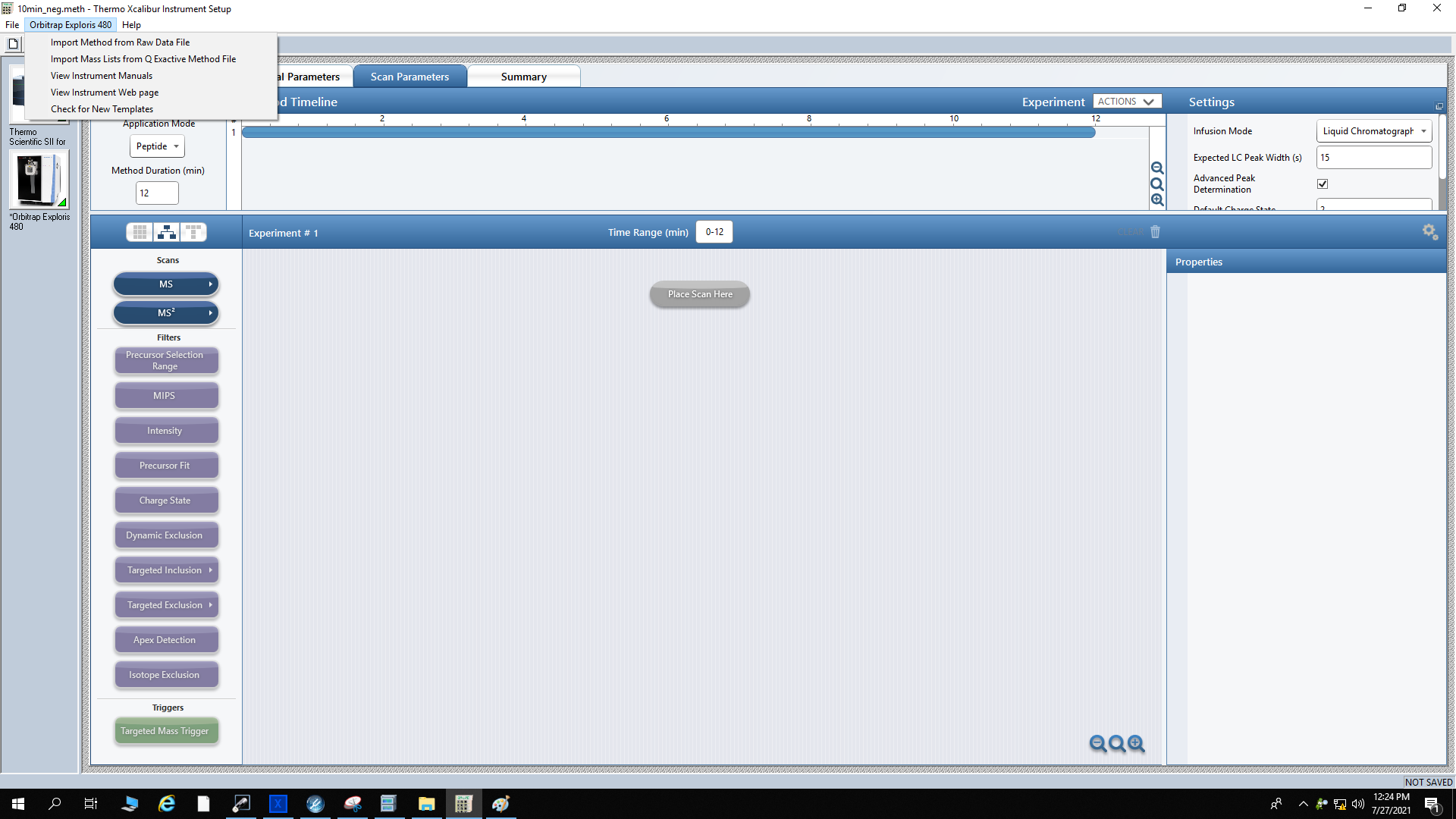 2) 질량분석기 부분이 비어있는 method를 불러옵니다. 메뉴에서 Orbitrap Exploris 480을 선택한후 "import Method from Raw Data file" 을 클릭합니다.