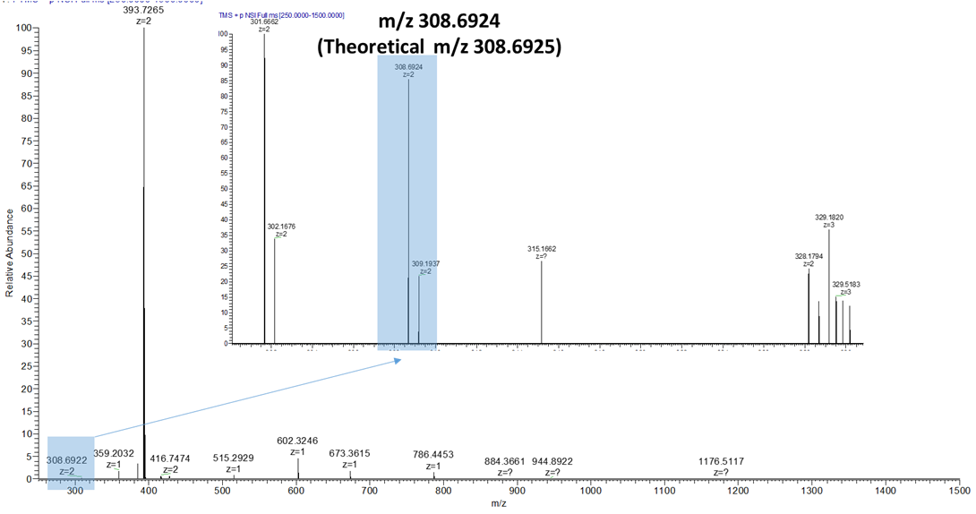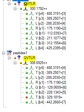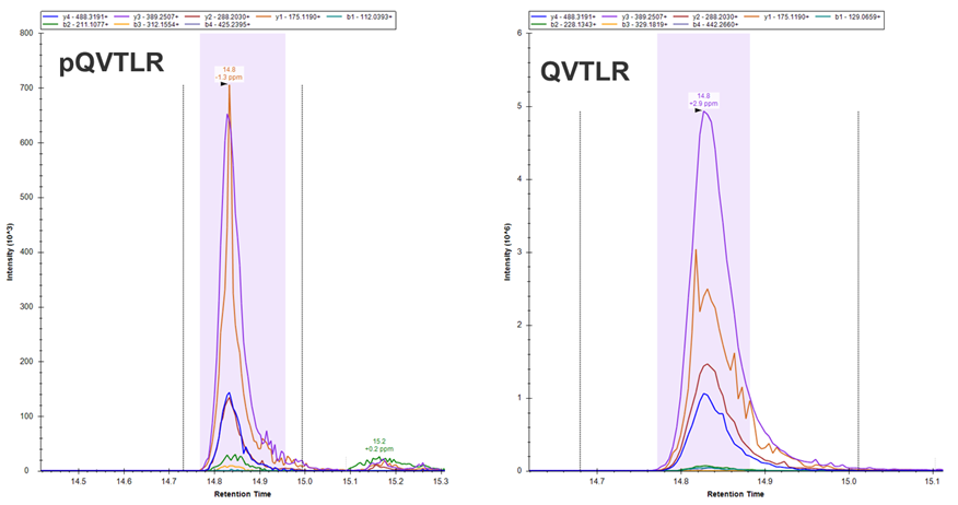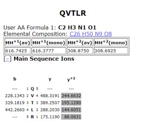 QVTLR의 이론적인 m/z 는 308.6925(2+) 이며 pQVTLR의 m/z 300.1792 (2+)입니다.