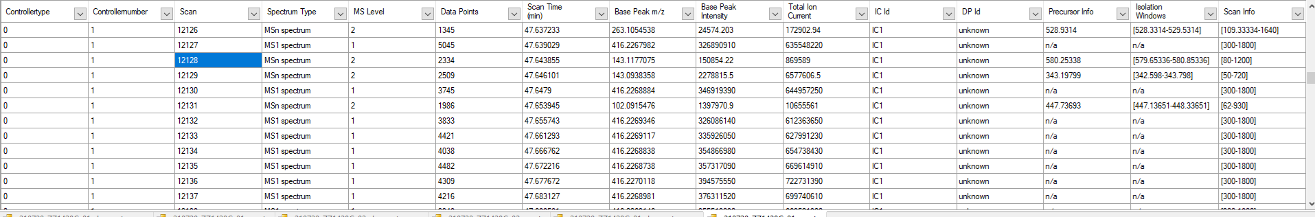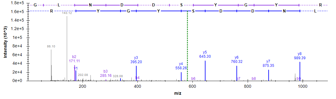 Proteome Discoverer를 통해 얻어진 펩타이드 GLNDDSYGYR 를 찾아보겠습니다. 실제 검출된 스펙트럼에 해당하는 scan number 12128 입니다.