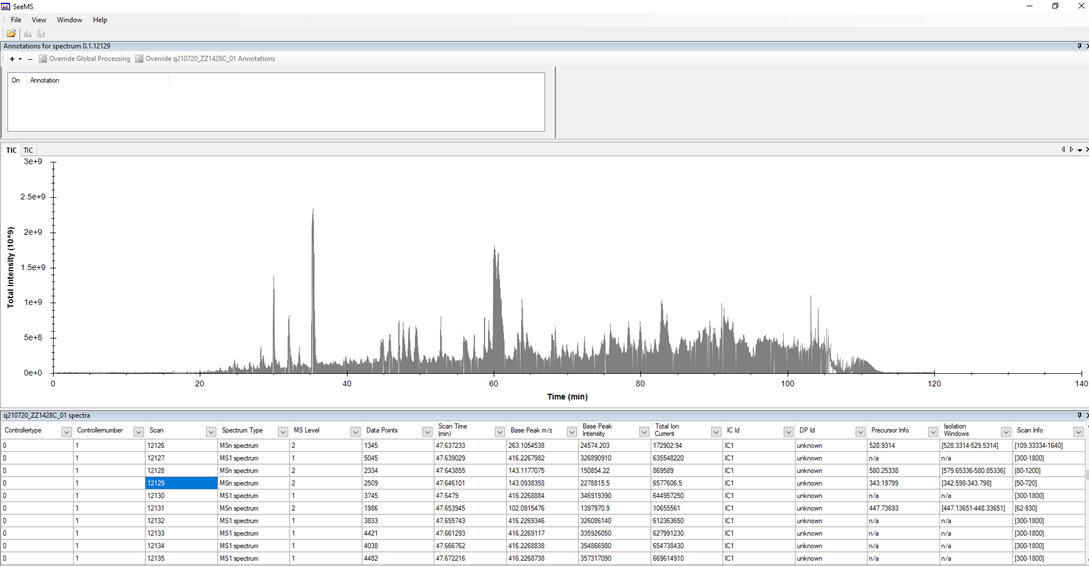 해당 프로그램을 열고 원하는 raw파일을 엽니다. 아래와 같이 TIC 스펙트럼과 함께 아래 각 피크에 대한 정보가 테이블로 나타납니다.