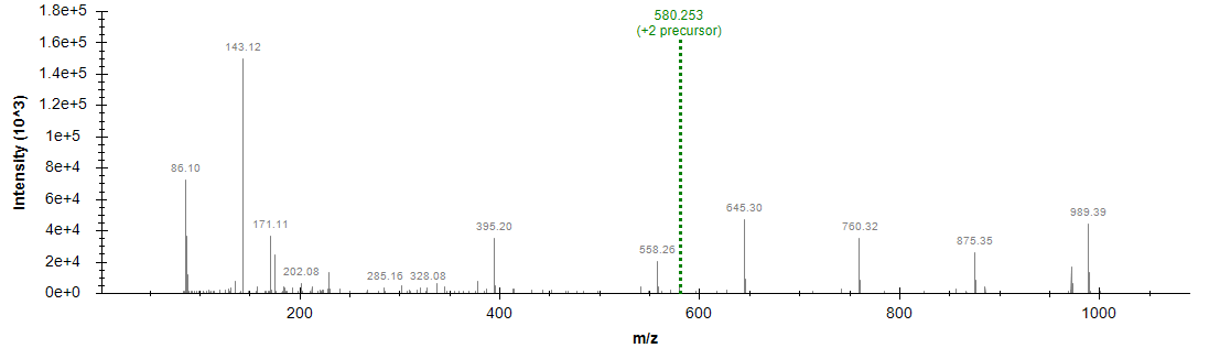 m/z값을 이용하여 테이블에서 찾은후 위와 같은 방법으로 진행하면 됩니다. 아래와 같이 스펙트럼이 얻어졌습니다. 즉 검색프로그램이 없어도 원하는 펩타이드의 검출여부를 SeeMS를 통해 간단히 확인할수 있습니다.