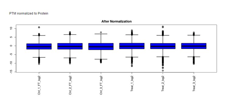 이를 위해서는 해당 시료에 대해 global proteome 정량분석을 동시에 수행합니다. 전체 단백질의 정량분석과 특정 PTM 정량분석을 동시에 수행하여 PTM 특이적인 결과를 산출해야 합니다. 이 프로그램은 위와 같은 과정을 수행합니다.