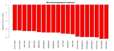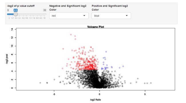 이 값을 이용하여 PCA, Volcano plot등을 만들수 있습니다. 얻어진 모든 결과는 파일로 다운 받을수 있습니다. 아래는 Volcano Plot 그래프입니다.
