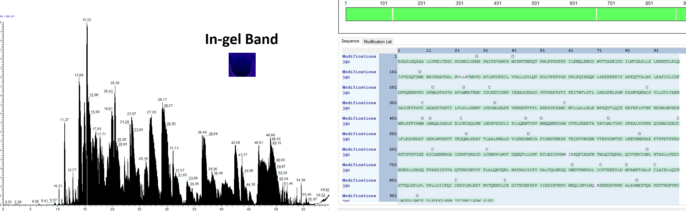 최근에 분석한 gel-band 중에서 가장 높은 Sequence coverage가 나온것 같다. 아래그림은 Base-peak chromatogram (왼쪽)과 Proteome discoverer(오른쪽, 약간 흐리게 처리) 에서 검색된 화면이다