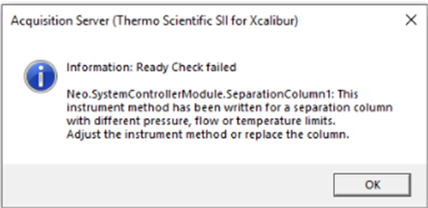 스크린에서 업데이트한 정보가 기존에 Method에서 설정된 컬럼정보와 일치하지 않으면 분석시작전에 아래와 같이 오류메세지가 나옵니다.