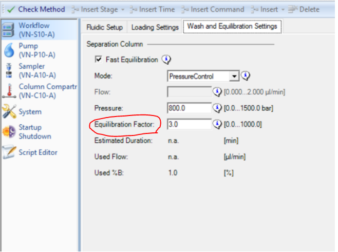 컬럼정보입력은 이러한 Equilibrium의 시간과 양을 조절하는데 사용됩니다. Equilibrium Factor 는 보통 컬럼 Volume의 3배정도를 입력합니다. 2배를 해도 무난할듯합니다. 아마 C18 Materials이 없는 빈 컬럼으로 계산된 Volume이라 예상이 됩니다. C18 Materials이 충진되어 있으면 계산된 Volume에 비해서 더 적을것 같습니다. 실험실에서 충진한 컬럼으로 사용할 경우 heater 와 Viper tubing이 없는 경우가 많습니다. 즉 견딜수 있는 압력이 높지 않을것입니다. 이 경우 낮은 압력이 설정되어야 되며 이로 인해 Equilibrium 시간이 꽤 길게 됩니다.